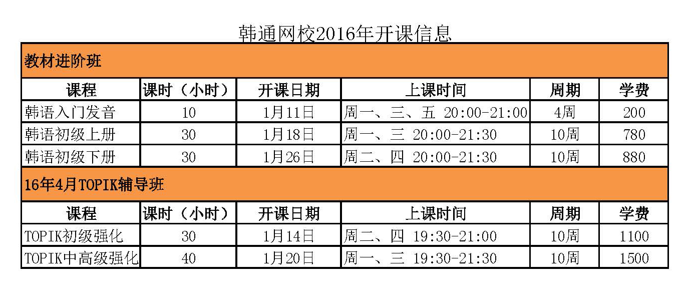 韩通韩国语网络课程(2016年1月) 发表时间:2016-01-03 00:35阅读次数: 淘宝链接:https://item.taobao.com/item.htm?id=525263086101 上一篇:韩通2016年开年好礼送不停 下一篇:韩通韩国语2016年3月全日制
